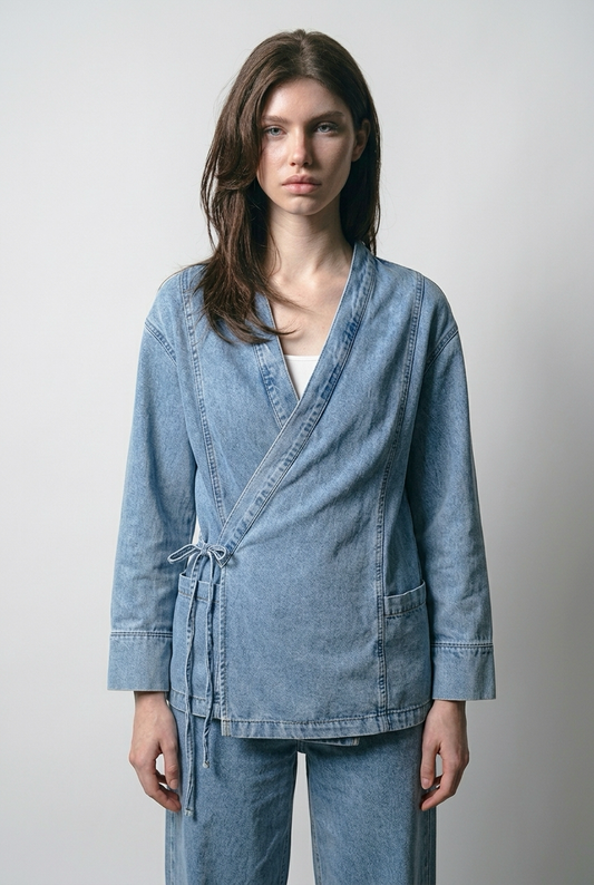 Ensemble veste en jean nouée sur le côté et pantalon large - Bleu brut