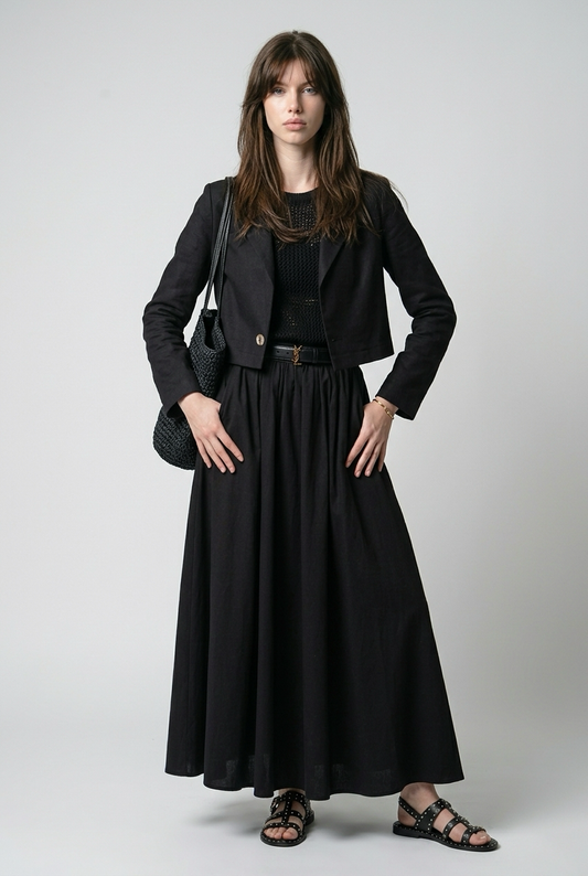 Ensemble Tailleur Lin Veste coupe carré et Jupe à volants - Noir