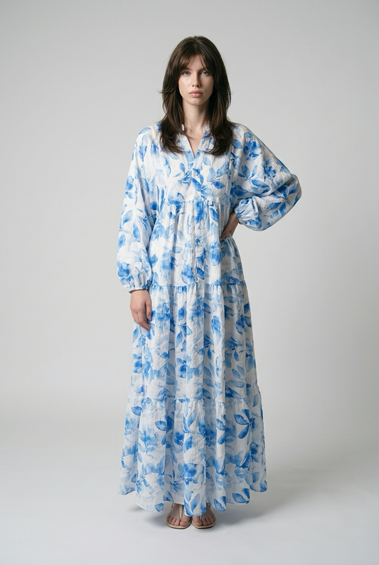 Robe boutonnée à manches ballon et imprimé fleurs - Bleu