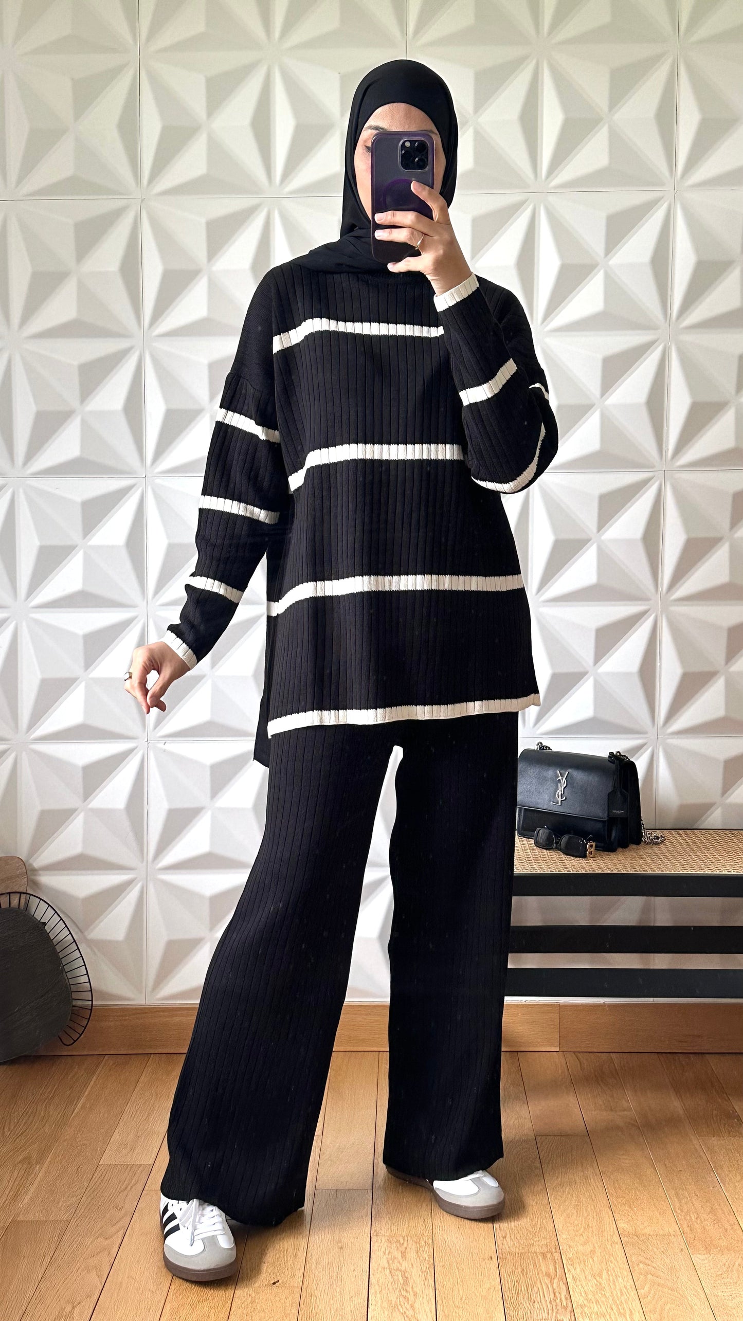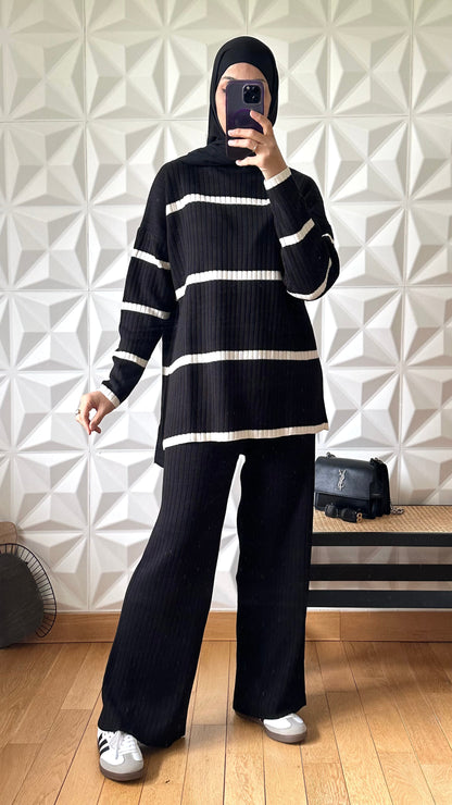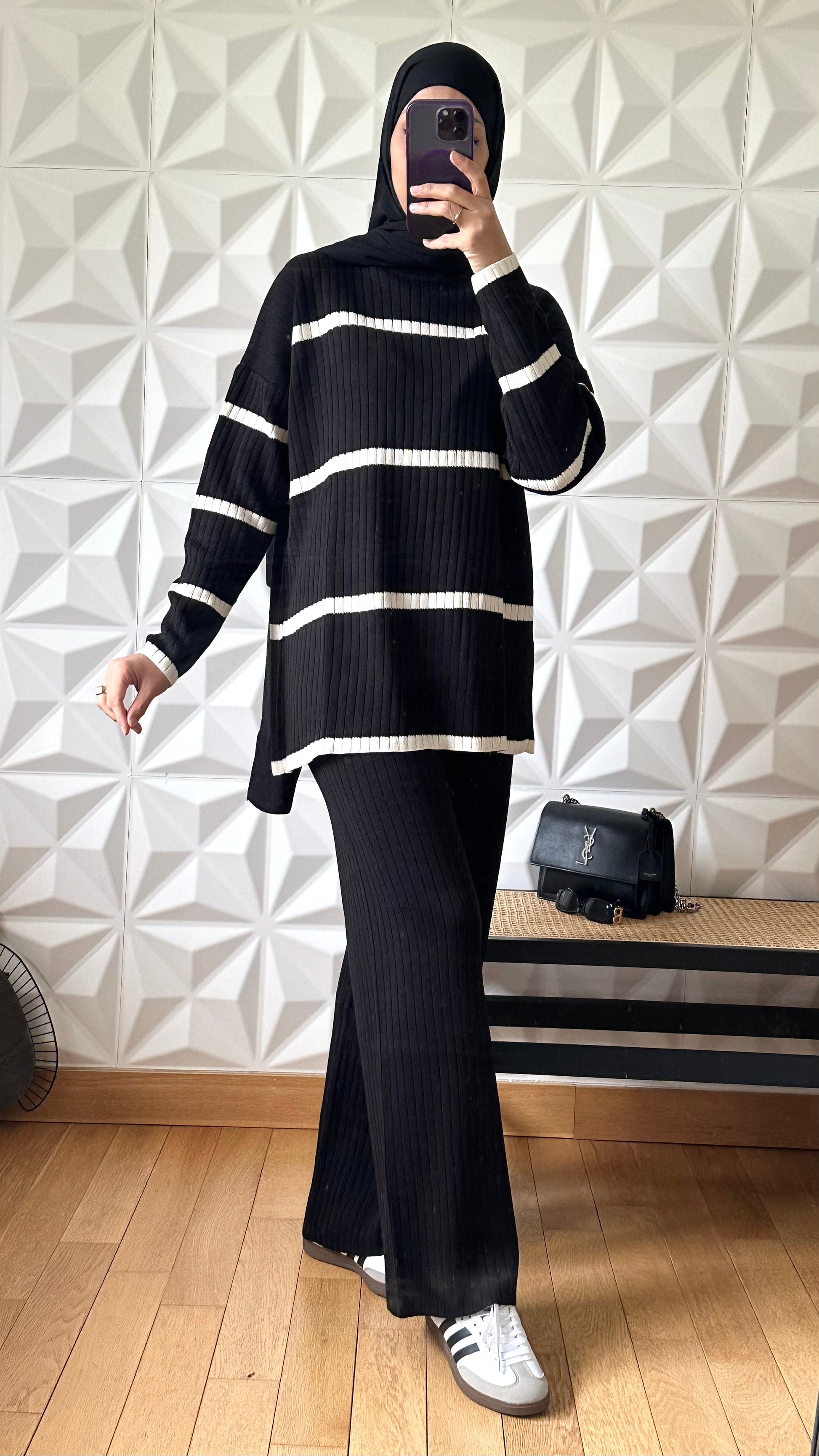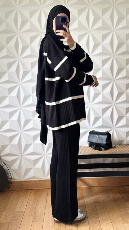 Ensemble côtelé avec pull à col montant rayés et pantalon - Noir et blanc