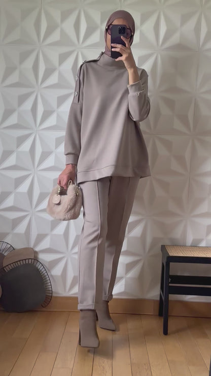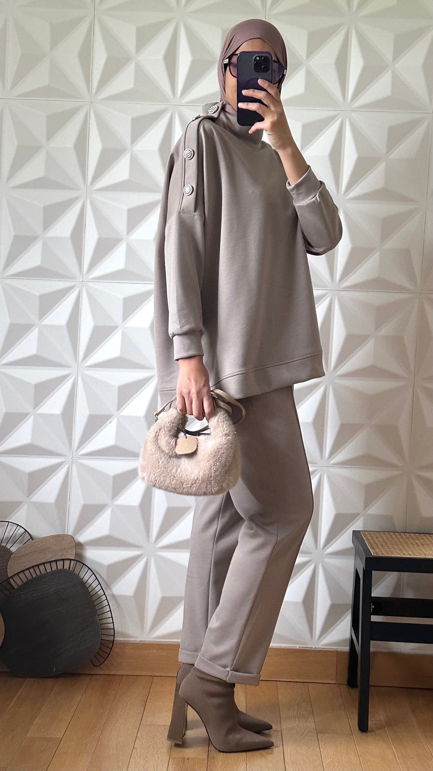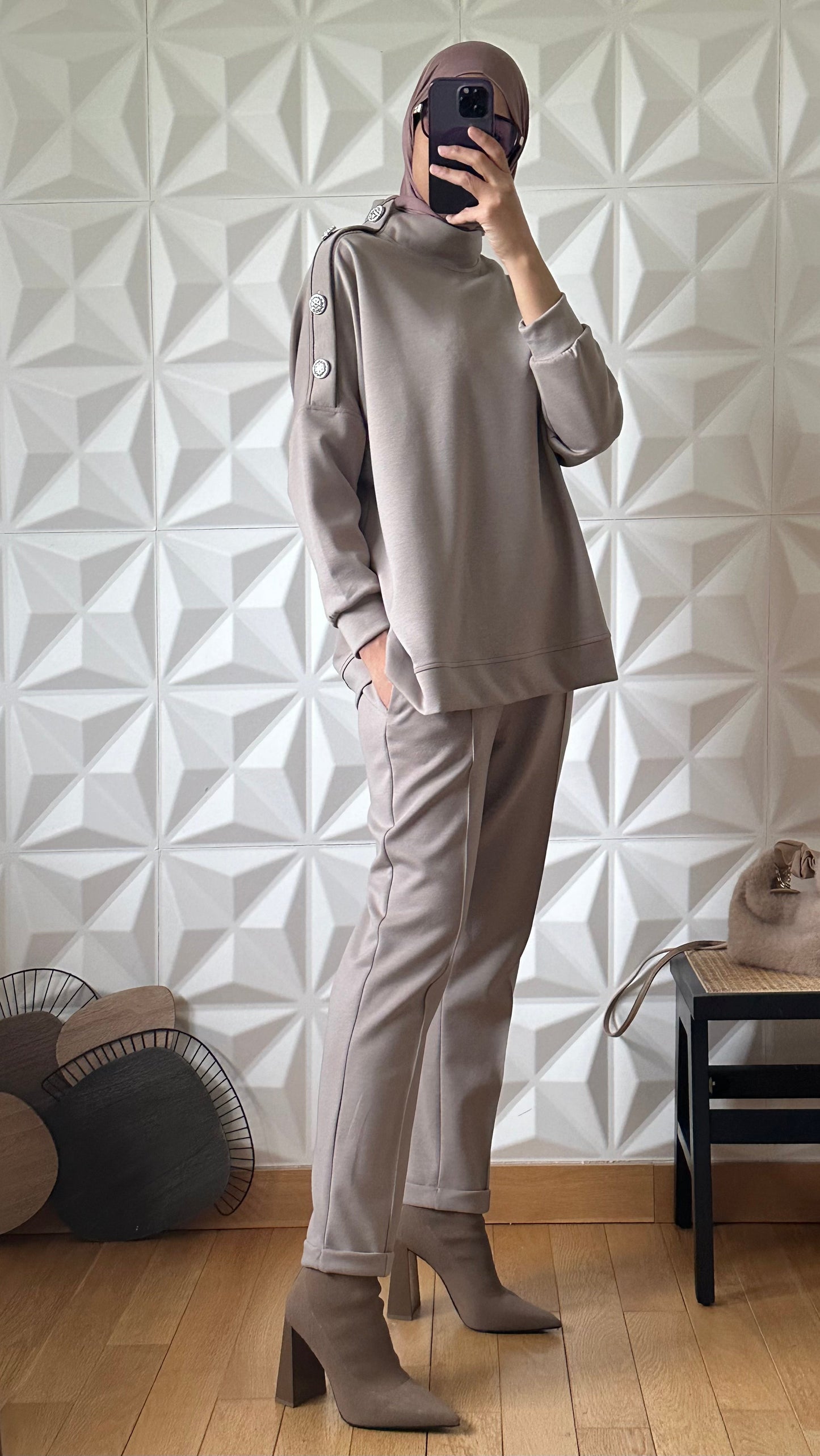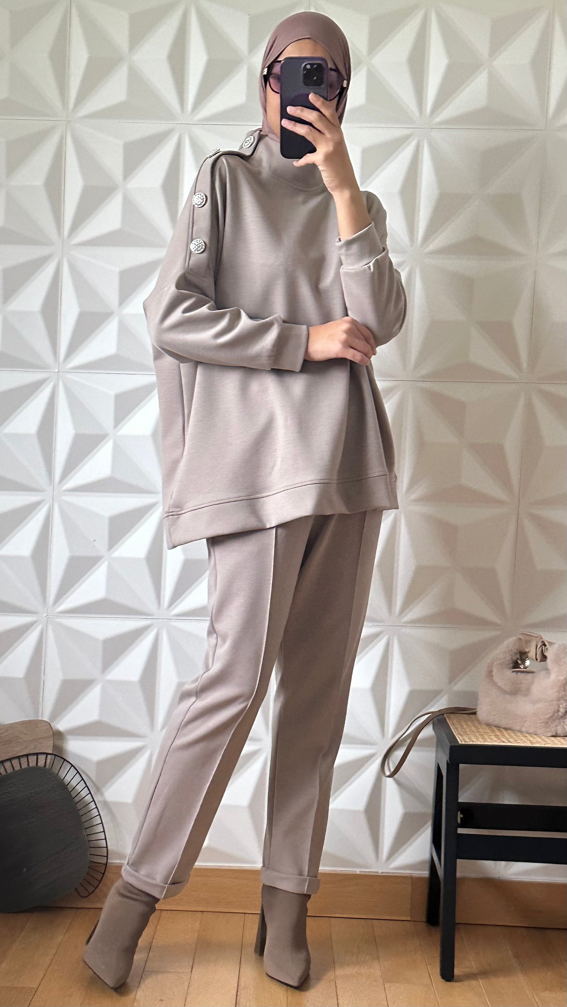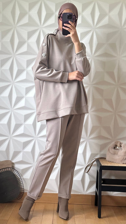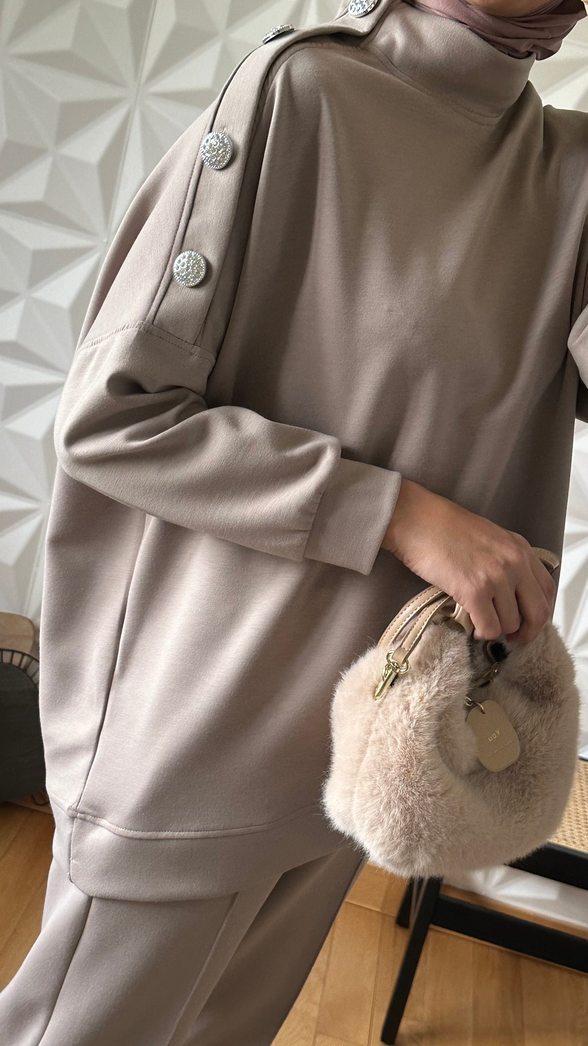 Ensemble pantalon et haut à manches asymétriques avec boutons en strass - Taupe