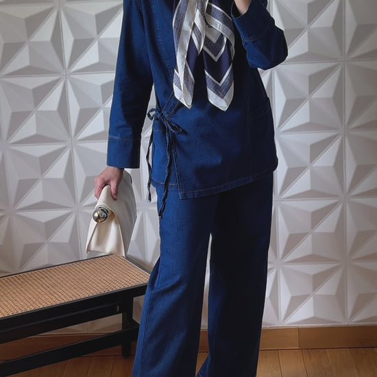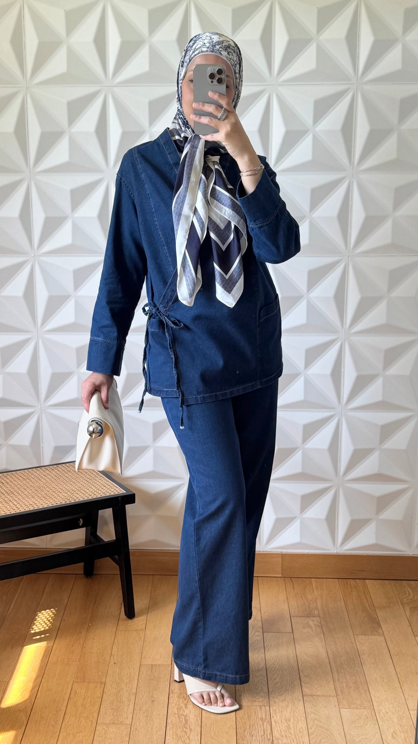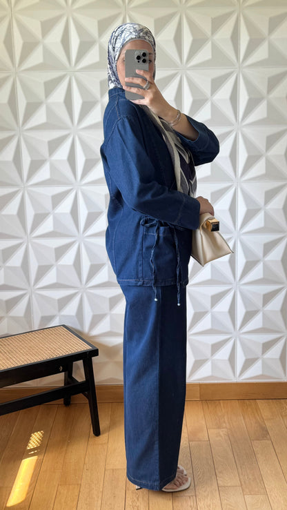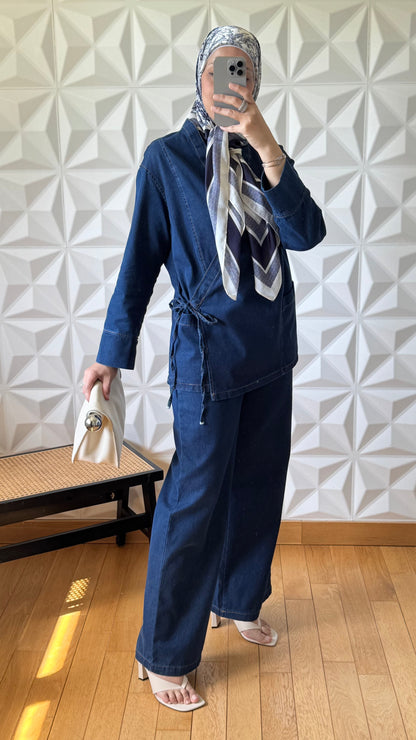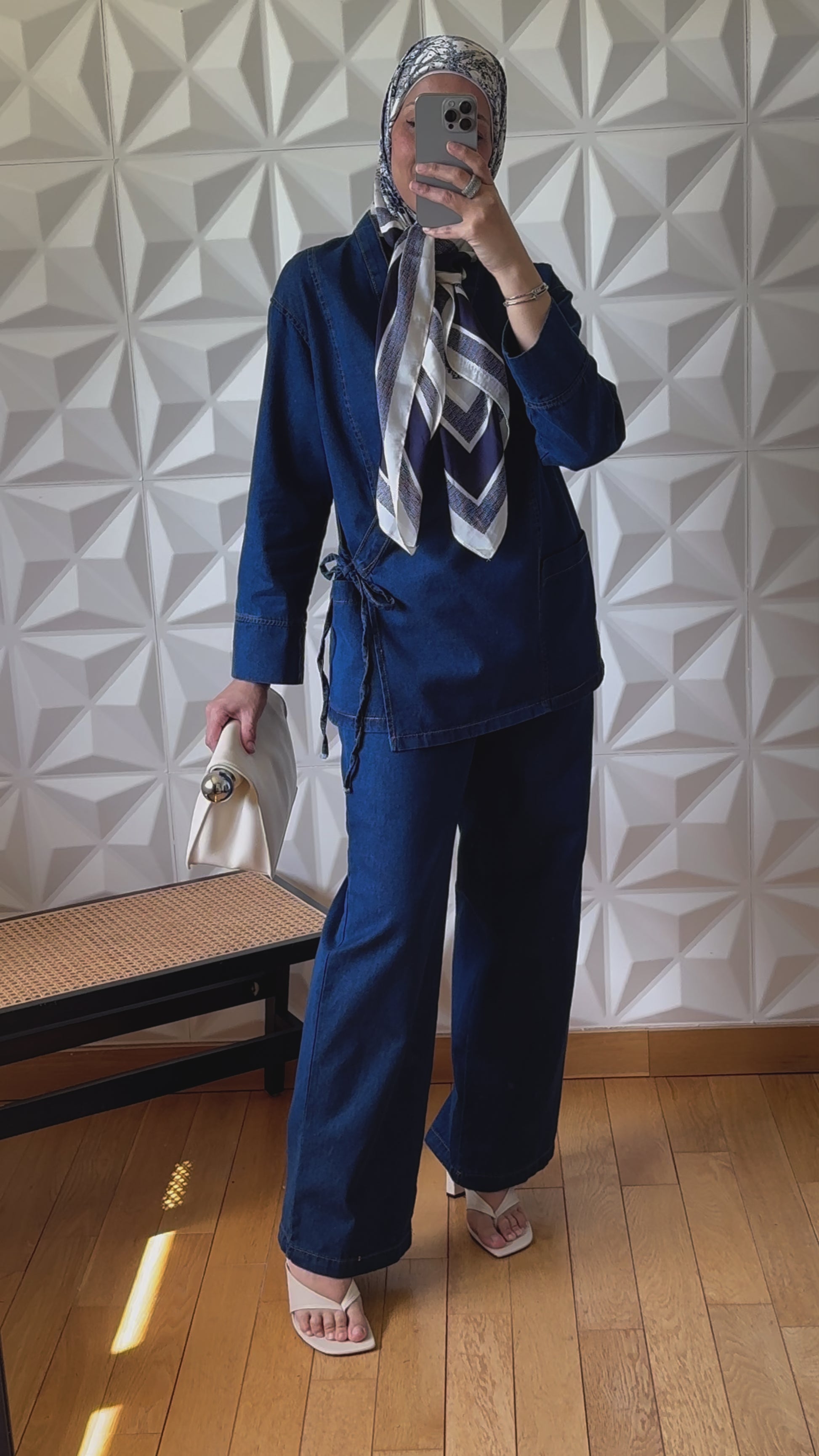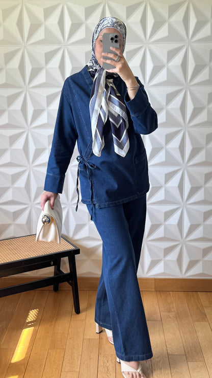 Affirmez votre style avec cet ensemble en jean aussi tendance que confortable. Composé d’une veste à nouer sur le côté et d’un pantalon large, ce look moderne revisite le denim avec une touche d’élégance et de modestie.
