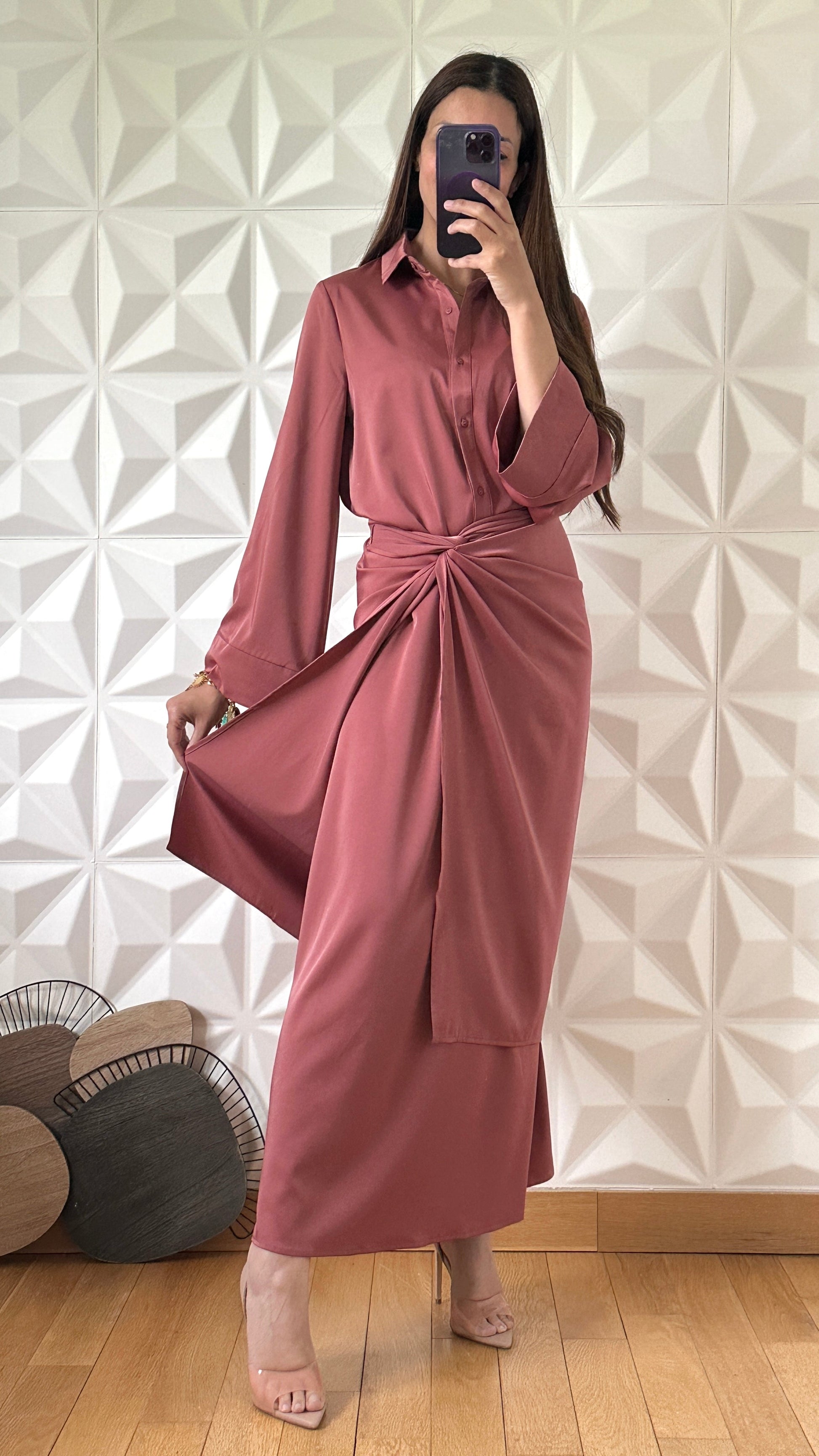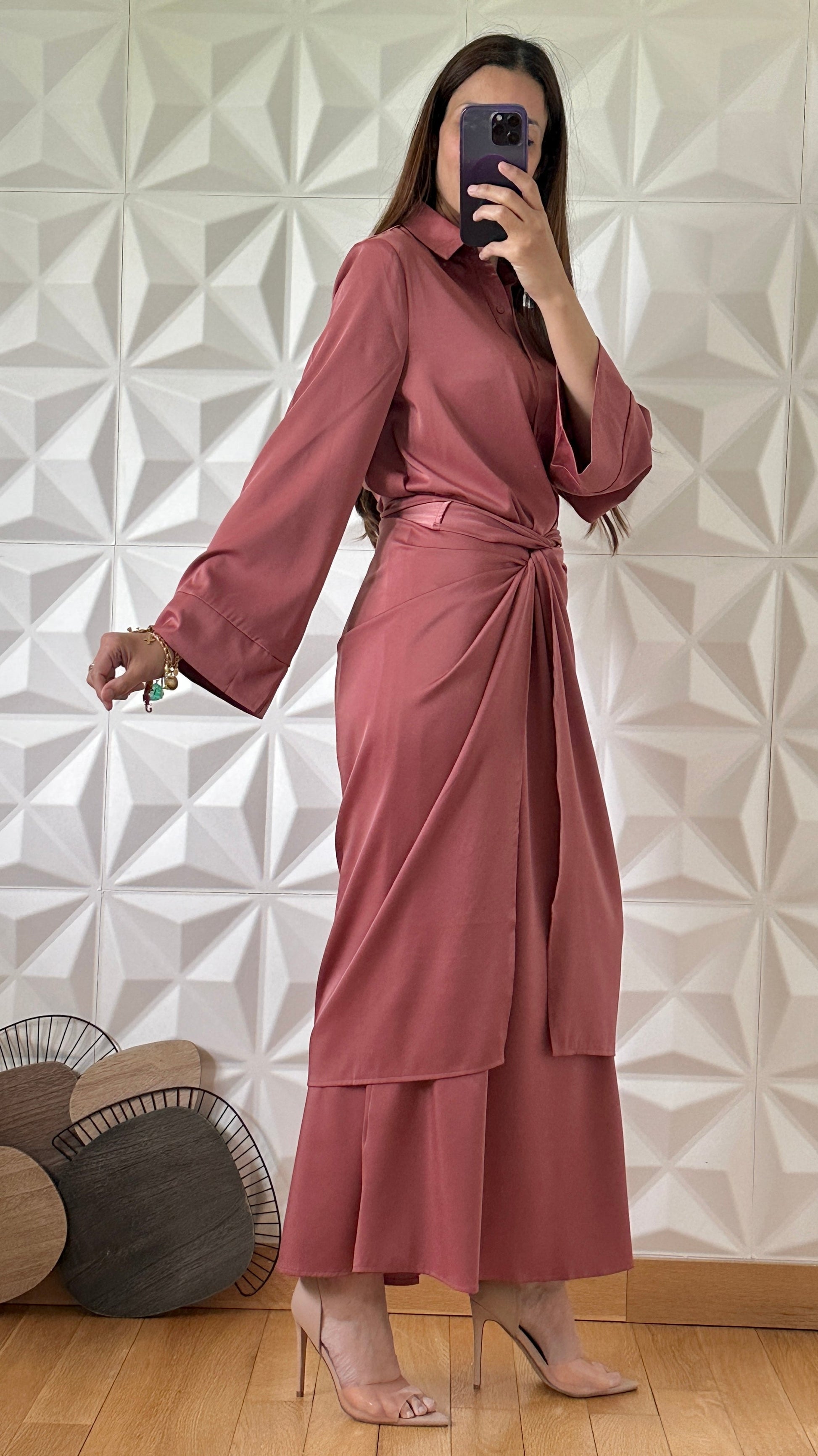 Robe boutonnée à manches longues et Jupe porte feuille - Rose