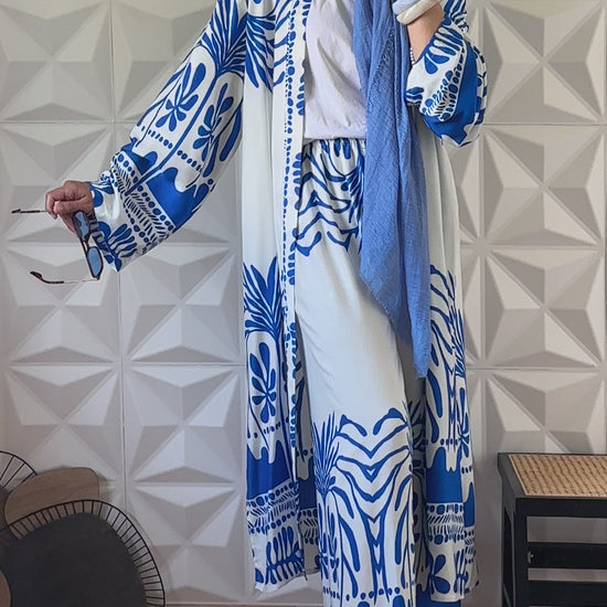Ensemble kimono long et pantalon large a motif olivier - Bleu