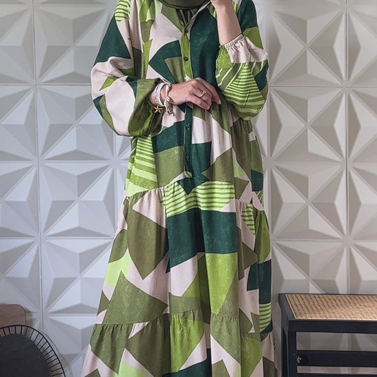 Adoptez un look moderne avec notre robe boutonnée à manches ballon et imprimé géométrique. Confectionnée en viscose douce et légère, elle assure un confort optimal toute la journée. L'imprimé géométrique audacieux et les manches ballon ajoutent une touche artistique et féminine.